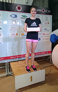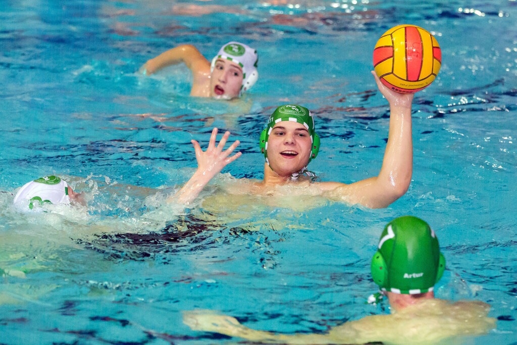 Zur Zeit gibt es 4 Wasserballaltersklassen bei der SSV. Bereits im vorigen Jahr präsentierten die damals 8-11 jährigen jüngsten Eleven ihre ersten Schritte bzw. HAND-lungen mit dem Wasserball. Diesmal zeigten diese U13- Spieler gegen die auf Traineranweisung passiv spielenden U18-Jugendlichen eindrucksvoll, dass es nun nach „Wasserball“ aussieht, was sie in dem vergangenem Jahr gelernt haben. Die Eltern und anderen Fans beklatschten und betrommelten jeden Treffer der Kleinen, die sich teilweise schon recht robust gegen die bedeutend Älteren im Wasser behaupteten. Mit 7:6 für die kleinen endetet nach 2x10 Minuten Spielzeit das erste Tagesmatch. Die Kleinen die hier an dieser Stelle alle einmal namentlich genannt werden sollen – Janne Havenstein und Hannes Opitz im Tor, Niclas Arnusch und Niclas Stredak, Arthur Nier, Jannes Krasa und Marcel Mattner, so wie der gaaanz kleine Lukas Timm, der an diesem Abend noch nicht mit spielte, wuchsen in diesem Jahr als Team zusammen und zeigten in den Trainingscamps, dass sie viel Ehrgeiz entwickelten, um sich an die Großen heranzuarbeiten.