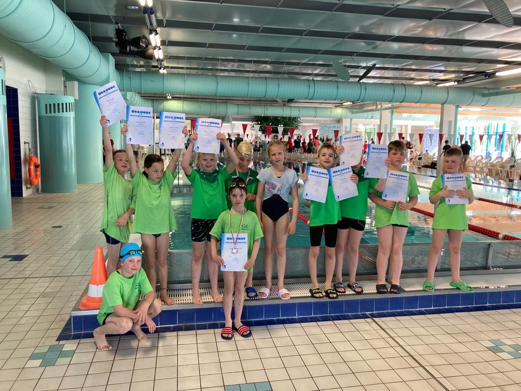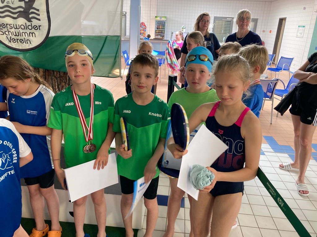 Wie kleine Profis gingen alle voll motiviert an den Start. Mindestens vier Starts standen auf dem Programm. Mira Littmann konnte sich als erfolgreichste Schwedterin 1 x Gold ,1x Silber und 2x Bronze erkämpfen. Über einmal Gold und einmal Bronze konnte sich Naira Fatke freuen. Tim Krauße holte sich über 50m Brust die Silbermedaille. Leider verpasste Mats Fiebig seinen 1. Platz in 50m Kraul Beine durch eine Disqualifikation. Schade! Aber auch alle anderen Kinder wie Stine Graudenz, Paul Grützmacher, Greta Krauße, Alva Buchholz, Till Knobbe, Jacub Marcizewski und Lina Sternkicker schwammen richtig gut und erlangten großartige Bestzeiten. Super!!! Der Höhepunkt des Wettkampfes war die Überraschungsstaffel, wo die Schwedter mit zweit Mannschaften antraten. Dort belegten die Schwedter einmal den 4. und einmal den 7. Platz. Herzlichen Glückwunsch. Alle Schwimmer können sich über die guten Ergebnisse freuen. Ein Dankeschön geht auch an die beiden Kampfrichter Sandro Fatke und Jörg Graudenz. Ohne Kampfgericht ist kein Wettkampf durchführbar. Auch ein Dankeschön an Madeleine Littmann für die Unterstützung des Trainers beim Ablauf des Wettkampfes.